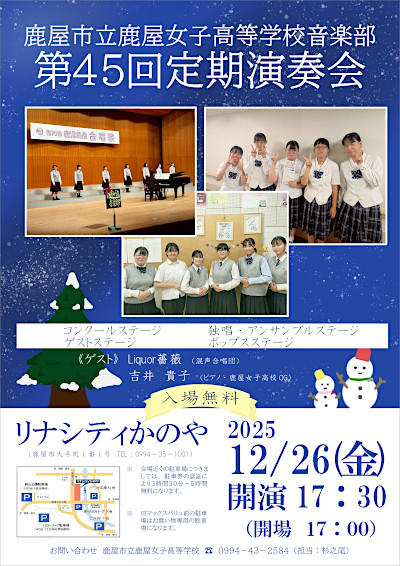 本校音楽部による第45回定期演奏会が12月26日(金)に開催されます。 保護者をはじめ,地域の多くの皆様のご来場をお待ちいたします。