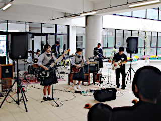 きょうの昼休みに,軽音楽部による新入生歓迎ライブが開催されました。 軽音楽部のバンド5組が,人気のJ-POPを演奏しました。 新入生をはじめ,多くの生徒が軽快な音楽を楽しみました。