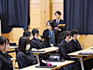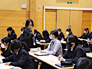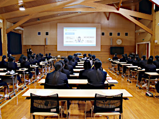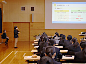 きょうの午後,情報ビジネス科2年生を対象としたキャリア講演会が行われました。 有限会社スカイピーシーから,キャリアコンサルタント資格保有者2名にお越しいただき,生徒たちの将来の職業にまつわる貴重なお話をしていただきました。 生徒たちは,真剣な表情で講師の先生方の話を聞きました。
