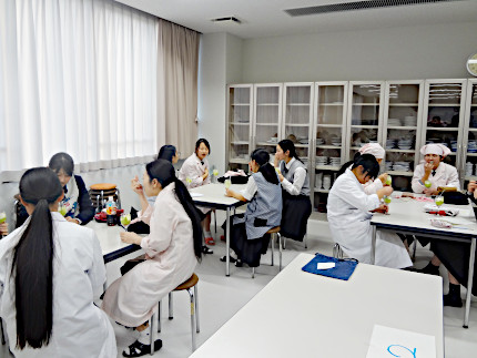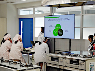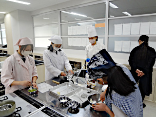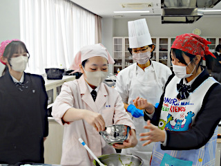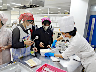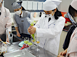 1月26日(月)の放課後,家庭クラブ料理講習会が開かれました。 スピリッツオブマイスター専門学校(福岡県)の先生方を講師に迎え,「抹茶・ クリームチーズ・ ヨーグルト ・ ホワイトチョコのコンポジション」のテーマで,スイーツの作り方を教えていただきました。 生徒たちは,自分たちで泡立てたクリームに,アイスクリームや抹茶パウダーなどを盛り付けたりして,美味しいスイーツ作りを体験しました。