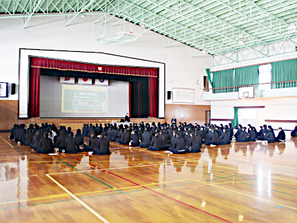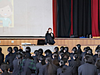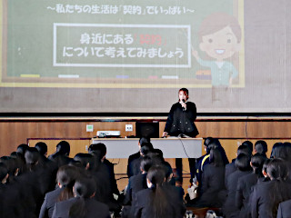 3年生登校日の今日の2限目に多目的ホールで,3年生対象の消費生活講座が開催されました。 鹿屋市役所商工観光課消費生活センターの方にお出でいただき,様々な消費者問題の事例とまきこまれないためにはどうすればよいか丁寧に説明されました。 3年生は将来のために,真剣に話を聞きました。