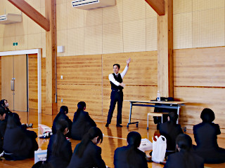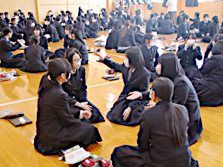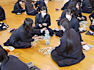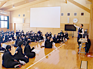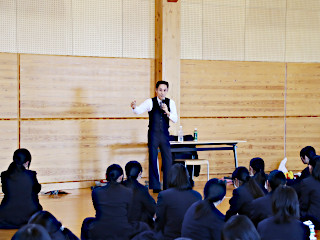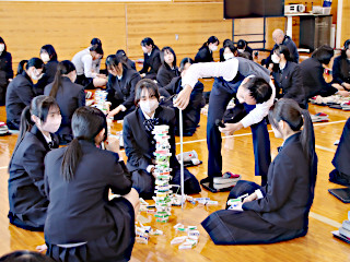 昨日の午後,多目的ホールにて第一幼児教育短期大学の出前授業が開講されました。 第一幼児教育短期大学幼児教育科の伊達幸博先生が,総合選択制を受講している本校2年生に授業を行いました。 じゃんけんゲームや牛乳パックリングタワーなどの幼児達が実際に行う活動を体験し,生徒たちは幼児教育への理解を深めることができました。 今回の出前授業で,本校生たちは大学の講義の雰囲気を感じることができました。
